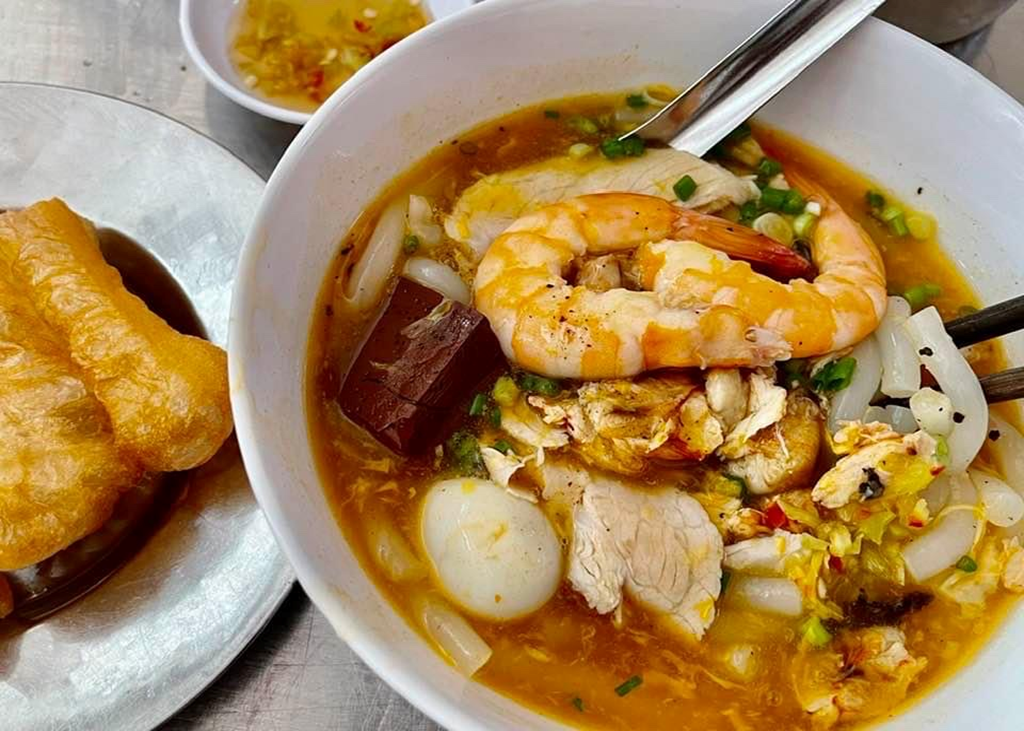 Crab Noodle Soup has a clear, slightly rich and fragrant broth, combined with chewy noodles. Served with shredded crab pieces, pork, boiled shrimp, and blood. In addition, fried breadsticks dipped in the broth add to the deliciousness of this noodle dish.