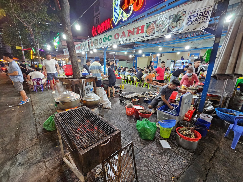As twilight descends, Nguyen Thuong Hien transforms into a bustling hotspot of nightlife and street food. The sidewalks are filled with a multitude of makeshift restaurants and food stalls, each offering a rich array of local delicacies. Diners, both locals and visitors, gather at these sidewalk eateries, where they can indulge in an assortment of shellfish and other culinary delights.