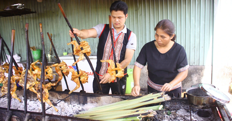 Grilled chicken with bamboo rice is delicious and culturally significant. According to ethnic folklore, grilled chicken and bamboo rice are exclusively eaten during festivals and clan social events inside or beyond villages.