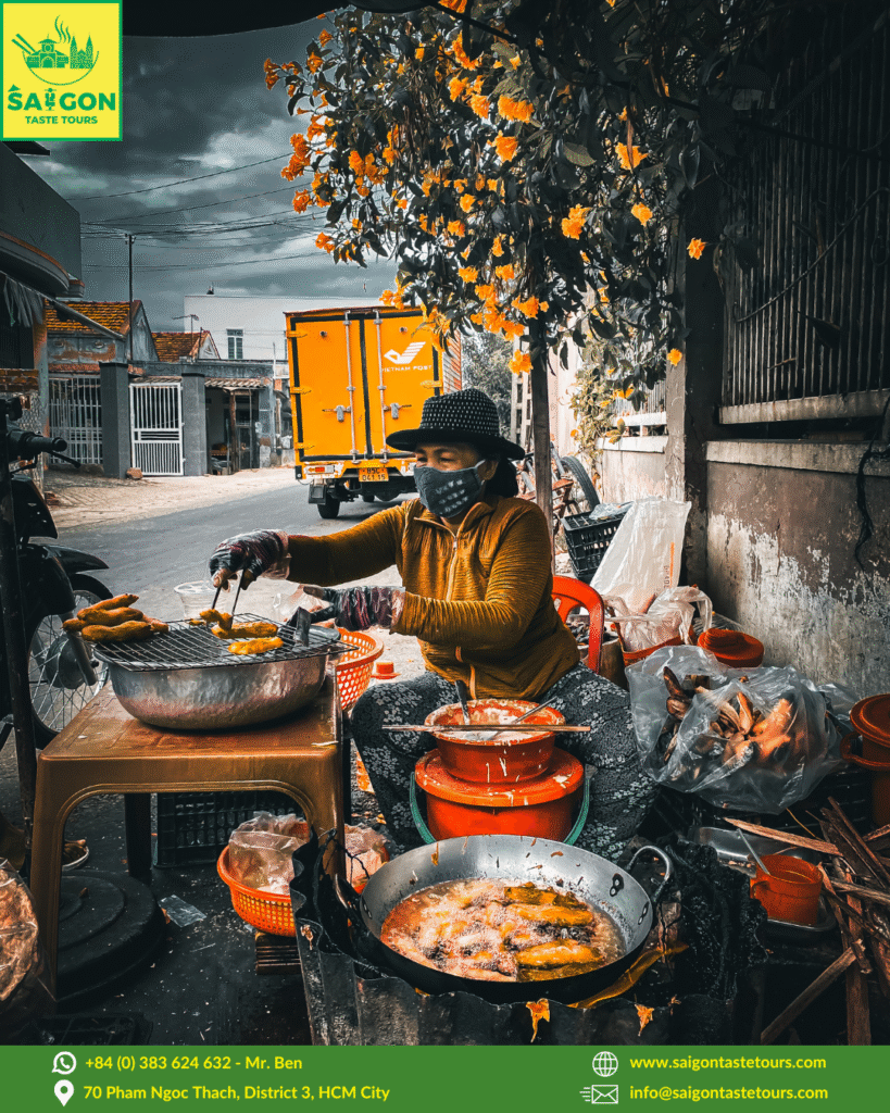 Hi friends, it’s Ben from Saigon Taste Tours again! Today was one of those perfect Saigon afternoons, the sun was shining, the streets were alive with the usual buzz of scooters, and my stomach was rumbling for something tasty. As I was riding through a small alley, the delicious aroma of fried snacks caught my attention. That’s when I discovered a humble little street food stall owned by the lovely Ms. Thu.