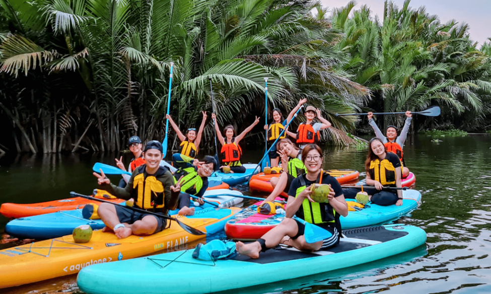 Paddleboarding has become increasingly popular among young people, with key spots in Phu My Hung, District 7, and Binh Quoi, Binh Thanh District, attracting many interests. In Phu My Hung, you can enjoy views of the lush greenery lining the riverbanks, while Binh Quoi offers a striking view of the Landmark 81 building.
