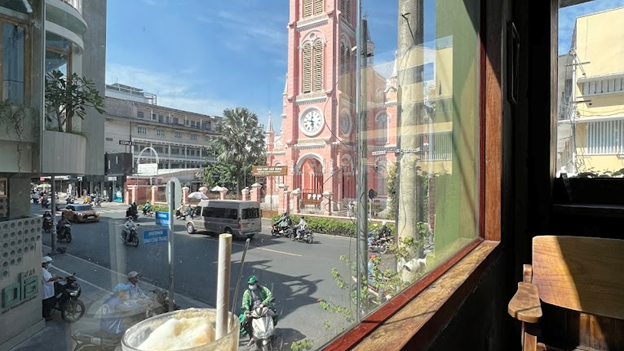 Diagonally opposite this cafe is Tan Dinh church, covered in bright pink, accentuating its personality. You can enjoy a drink here and take a few photos with this pink church.